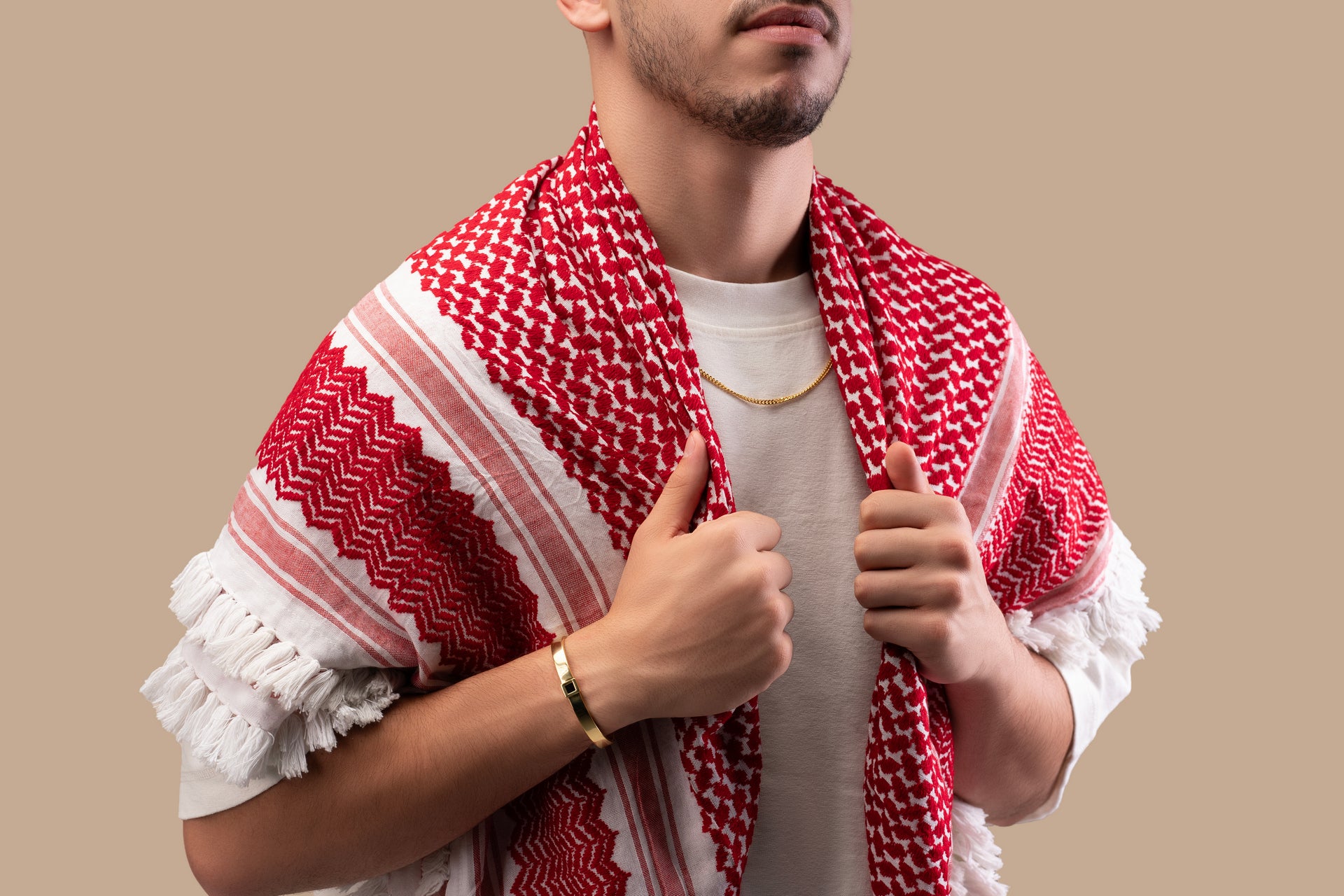 Two necklaces on a white background, one with blue beads and a gold clasp, the other with a gold crescent moon and star design. Two necklaces on a white background, one with blue beads and a gold clasp, the other with a gold crescent moon and star design.